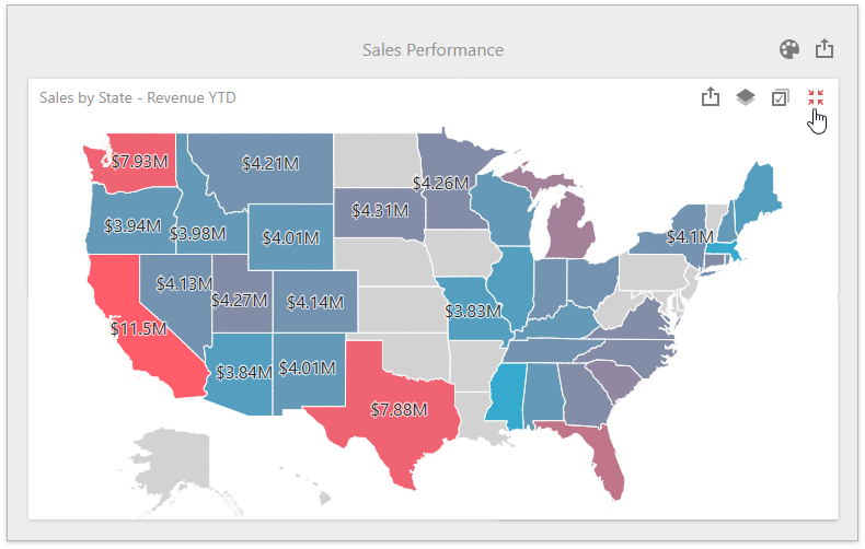 To maximize a dashboard item, click the Maximize button in the dashboard item caption.