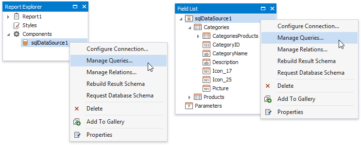 The newly created SQL data source will be displayed in the Components node of the Report Explorer. Additionally, the hierarchy of the data source will be reflected by the Field List. In both panels, you can right-click the data source to access its settings.