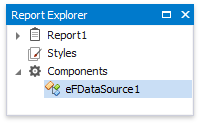 The newly created data source will be displayed in the Components node of the Report Explorer. Additionally, the hierarchy of the data source will be reflected by the Field List.