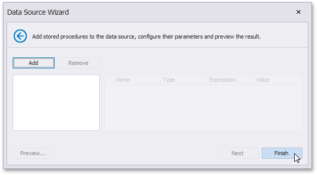 The next wizard page is available only if the current entity data model contains stored procedures. This page allows you to add stored procedures to the data source and configure their parameters. Click Finish to exit the wizard.