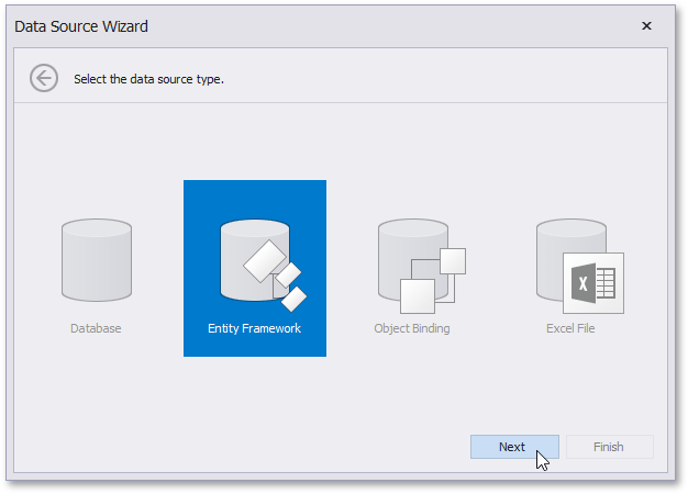 On the first page of the invoked Data Source Wizard, select the Entity Framework and click Next.