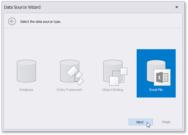 On the first page of the invoked Data Source Wizard, select Excel File and click Next.