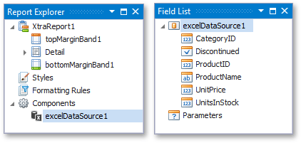 The created data source becomes displayed in the Report Explorer’s Components node. The Field List reflects the data source’s hierarchy.