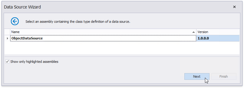 The following wizard page allows you to select an assembly that contains the data source’s class type definition. Use the Show only highlighted assemblies checkbox to exclude irrelevant assemblies from this list.