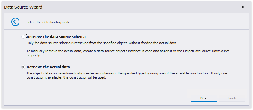 The next wizard page enables you to select whether to obtain the data source schema (enabling you to edit the report layout without having access to the actual underlying data) or retrieve the actual data from the data source. Choose the second option and click Next.