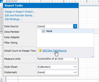 Click the report’s smart tag. In the invoked actions list, expand the drop-down menu for the Data Source property and click Add Report DataSource.