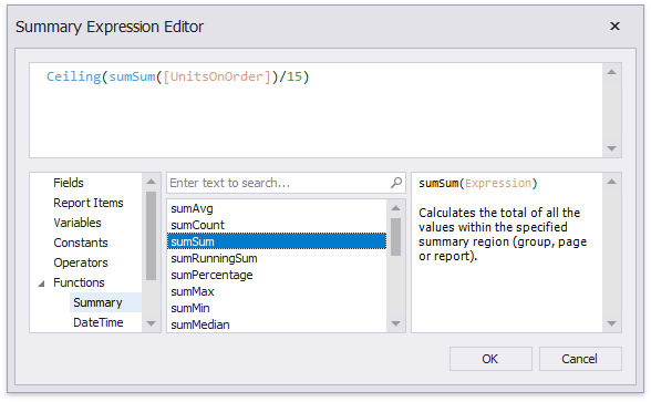Select the summary function in the Expression Editor's Summary section. All functions has the 'sum' prefix.