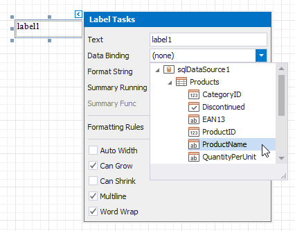 The control’s smart tag enables you to select the target data field in the corresponding drop-down list.