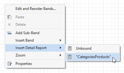 Create a Detail Report Band by right-clicking the report’s surface. In the invoked context menu, select Insert Detail Report, and then, select the master-detail relationship’s name.