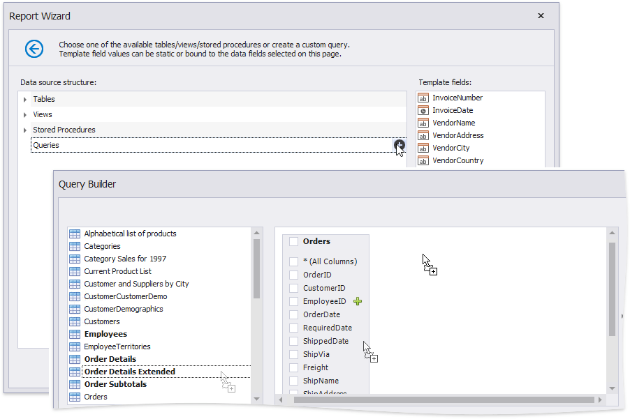 You can combine several different tables’ or views’ data fields by creating a custom query. Click the Queries category’s plus button, and in the invoked Query Builder, join data tables and views based on key columns.