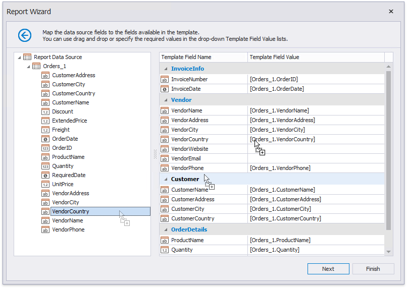 Drag and drop the required data field form the tree on the left-hand side onto the corresponding template field’s column.