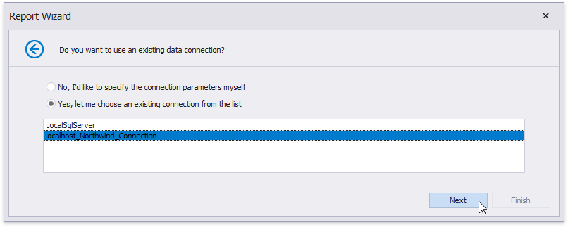 On the next wizard page, specify whether you want to use an existing data connection or create a new one. For this tutorial, select an existing connection and click Next.