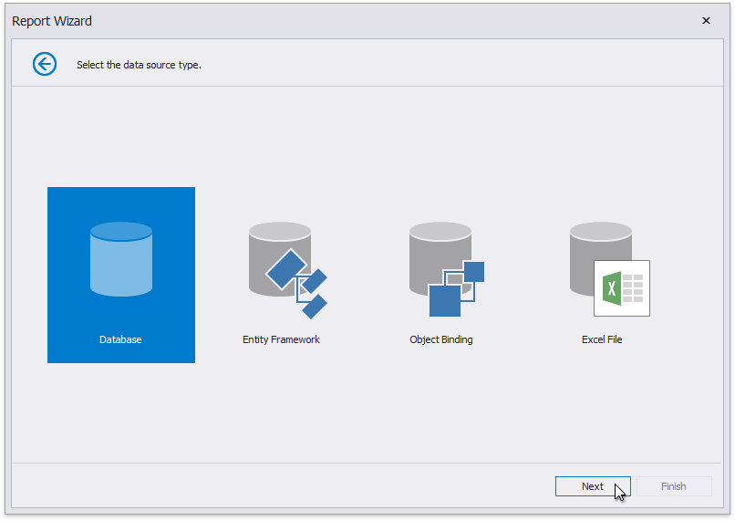 The following page allows you to select a data source’s type that provides data to your report. Choose Database and click Next.