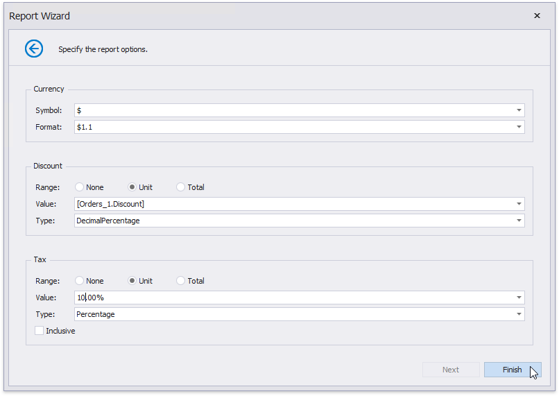 - Value- Specifies the discount/tax value that can be static or bound to the data source field.