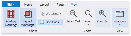 The Report Designer Toolbar includes the Home, Layout, Page, and View tabs for general commands as well as contextual tabs for commands relating to the selected report controls.