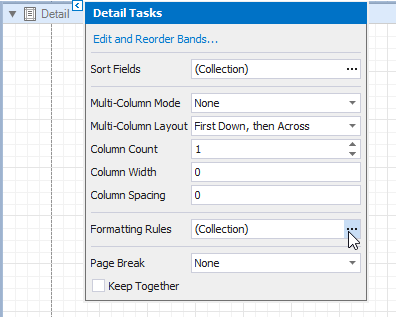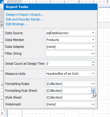 Click the report’s smart tag, and in the invoked actions list, click the Formatting Rule Sheet property’s ellipsis button.