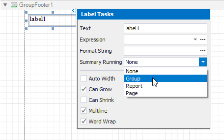 Drop a Label onto the group footer to display the summary result. Click the label’s smart tag and set its Summary Running property to Group.