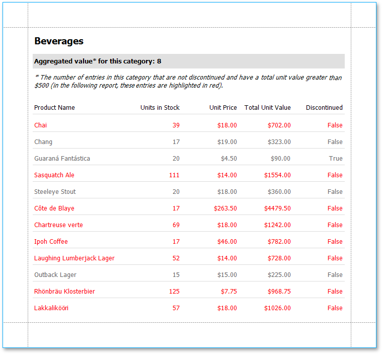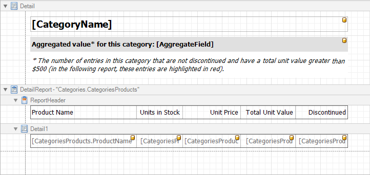 This tutorial describes the steps required to create a report with an aggregate function. In this example, products that are not discontinued and have a total unit value greater than $500 will be displayed.