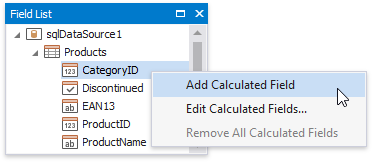 To create a calculated field, switch to the Field List, right-click any item inside the data source and select Add Calculated Field.