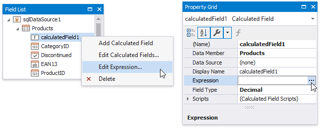 Right-click the calculated field in the Field List and select Edit Expression. Alternatively, you can select the calculated field, and in the Property Grid, click the Expression property’s ellipsis button.