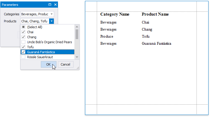 The following image demonstrates an editor for a multi-value parameter in a Print Preview.