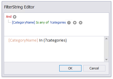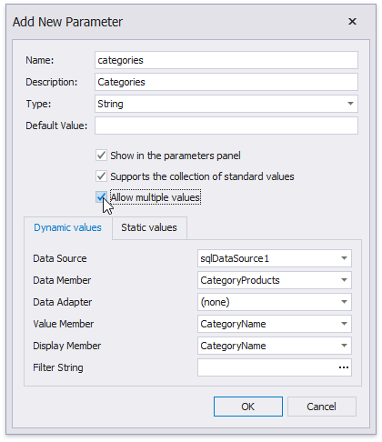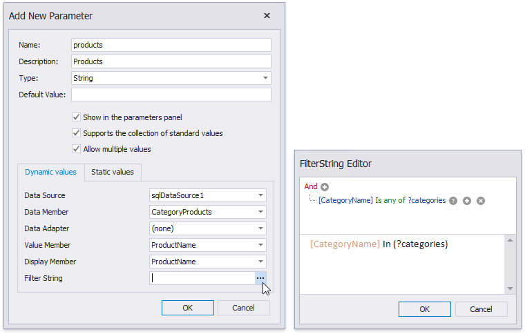 To filter the list of parameter values, click the ellipsis button for the parameter’s Filter String property in the Add New Parameter dialog window and specify a filter string that refers to another parameter.