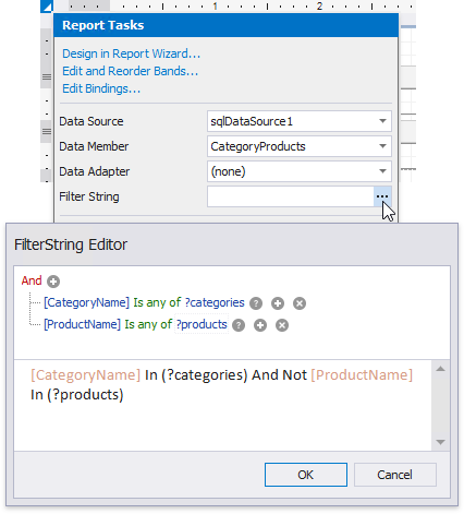 Click the report’s smart tag, and in the invoked actions list, click the ellipsis button for the Filter String property. In the invoked FilterString Editor, construct an expression that uses both parameters: