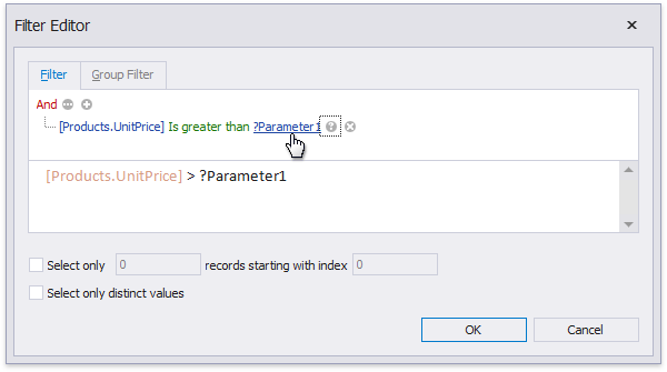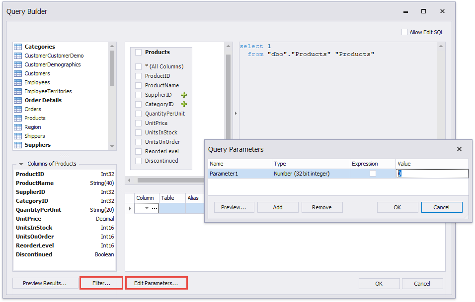 You can add new query parameters in the Query Parameters dialog and modify the filter within the Filter Editor.
