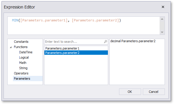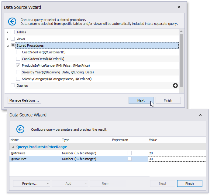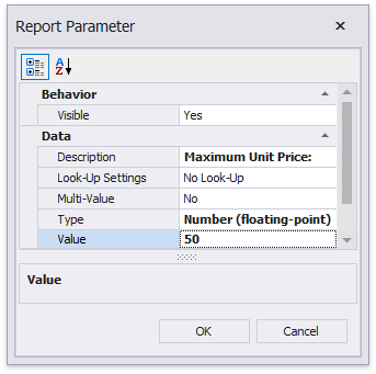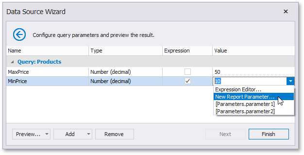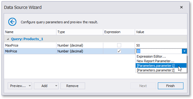 Below, you can see how a value is specified for a query parameter within the Data Source Wizard’s page. You can also specify query parameter values in the Report Wizard or the Query Parameters dialog in the same way.