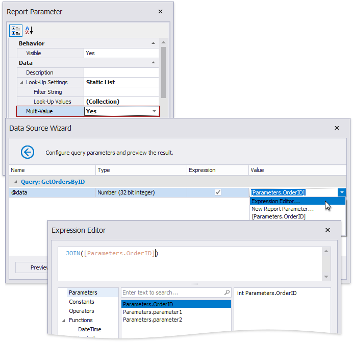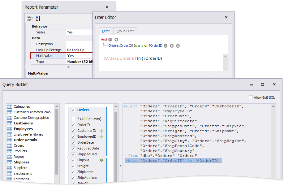 You can map multi-value parameters to query parameters. For instance, the following query selects the orders whose IDs can be found within the values the \@OrderID query parameter provides.