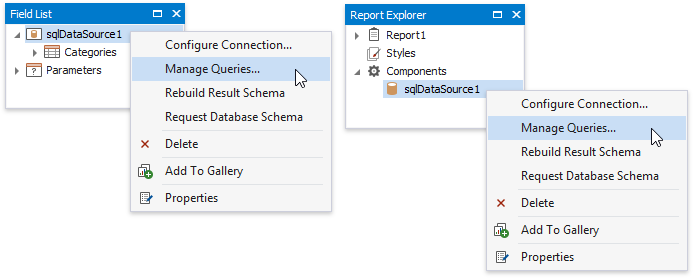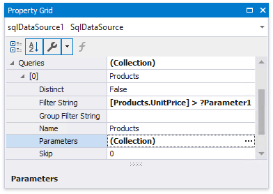 You can access query parameters using the Parameters property of the query the report’s SqlDataSource component exposes. These parameters include the ones you created within the Query Builder or that were generated for the data source’s stored procedure. You can also access the query’s filter string using the Filter String property. This filter string includes the filter that you specified in the Query Builder.