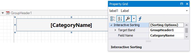 Use the label’s Interactive Sorting option to enable sorting report data by clicking this label in Print Preview. Set the Target Band property to the required Group Header or Detail band, and the Field Name property to the corresponding data field.