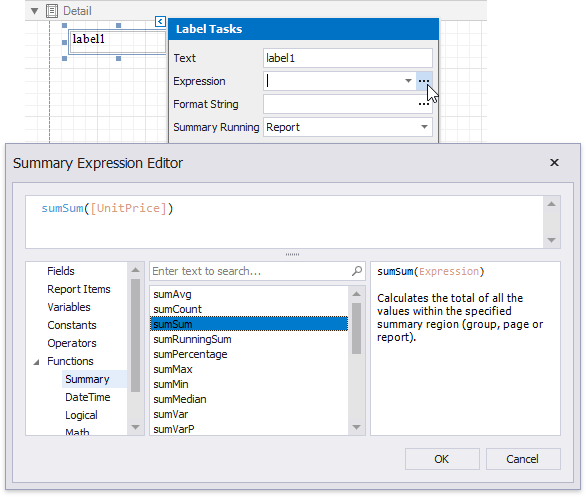 You can make the label display a summary function’s result by setting the Summary Running property to the required range and selecting the summary function in the Summary Expression Editor.