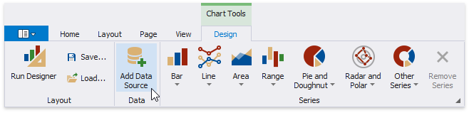Open the Toolbar’s Chart Tools contextual tab and click Add Data Source to bind the chart to data.