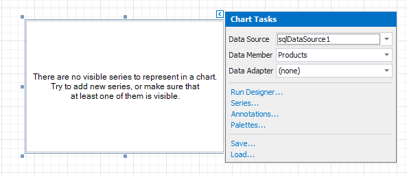 Click the chart’s smart tag and make sure that the Data Source and Data Member properties were specified correctly.
