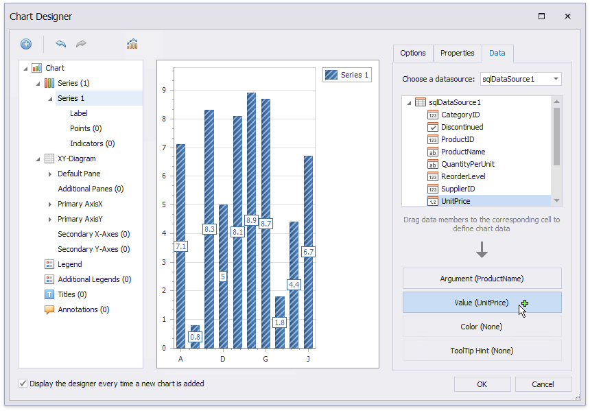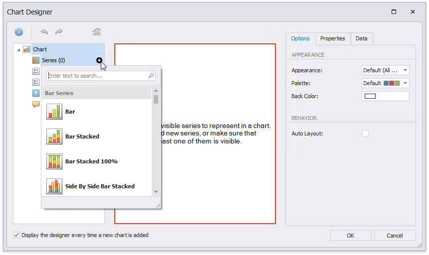 After you drop the chart, the Chart Designer is automatically invoked if its Display the designer every time a new chart is added option is enabled. Close the designer at this step.