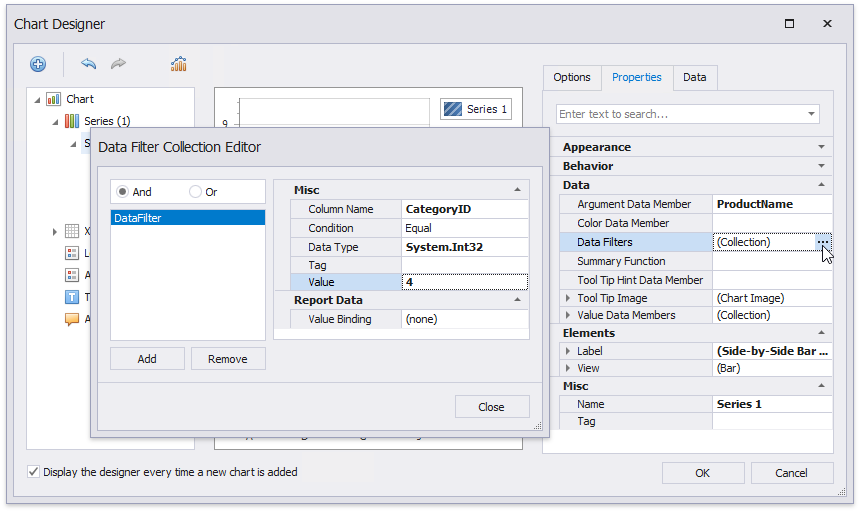 Click the Data Filters property’s ellipsis button to filter series data. You can create and adjust the filter criteria in the invoked dialog.