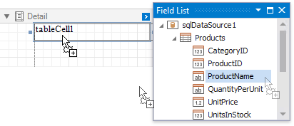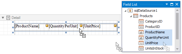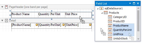 You can create a table control with cells bound to data fields obtained from a report’s data source using the Field List. Select data fields by clicking them while holding the CTRL or SHIFT key and drop them onto the Detail band.