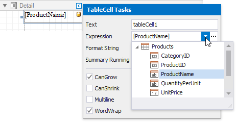 Alternatively, click the cell’s smart tag, expand the Expression drop-down list and select the required data field