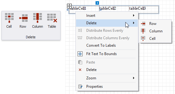 Use the Delete group in the toolbar’s Table Tools contextual tab or the Delete context menu items to remove table elements.