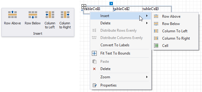 You can use the Insert group in the toolbar’s Table Tools contextual tab or the Insert context menu items to add new rows and columns. The added cells inherit the source cells’ size and appearance settings.